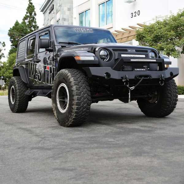 Westins WJ2 Full Width Front Bumper with LED Light Bar Mount is constructed with 3/16-inch plate steel and fits most double or single row 20 light bars. The product is designed to utilize both styles of factory fog lights or round post lights, and adjustable brackets accept Westin or competitor light bars. With Westins new WJ2 Full Width Bumper, your winch fits inside the bumper to allow maximum air flow to your vehicles radiator and is designed to allow winch installation with your bumper already installed -- most other brands wont! Features Rock Light mount points on lower bumper corners, holes to hide light harness wires, and 2 front off-road jack points. Product offers recovery hooks with a recovery shackle mount point to allow easy tow strap attachment. Includes bumper, mounting hardware and install instructions.