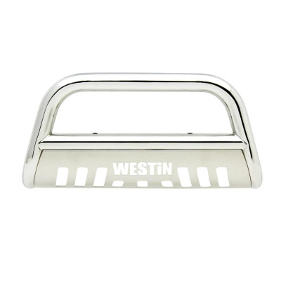 Westins E-Series Bull Bar is a front-end light bar designed for trucks and larger model SUVs. It mounts to the vehicles existing mounting points with no drilling required and comes complete with vehicle specific mount kit. It also features mounting points for 2 auxiliary lights up to 6 inches in diameter. The E-Series Bull Bar features a laser cut Westin block letter logo design on the skid plate. Available in black powder coated e-coated steel with a textured black skid plate backed by a 3 year warranty. Optional license plate bracket is available.