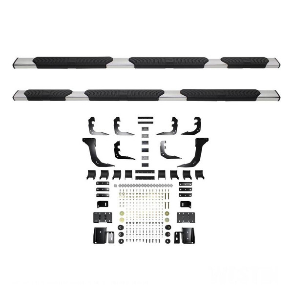 Get a boost, with Westins R5 M-Series Wheel-To-Wheel Nerf Step Bars. The extra wide 5in. footprint step design provides easier and safer vehicle access for both drivers and passengers. Developed and engineered in the USA, the R5 M-Series Wheel-to-Wheel Nerf Step Bars feature three oversized skid resistant step pads allowing easy access to the vehicle cab or truck bed cargo area. Built with high-grade and corrosion resistant steel designed to mount directly to your vehicles existing rocker panels. The modular design saves you money on shipping, as no truck freight costs are required. Also included are injection molded bracket covers for a clean and stylish look. Westins exclusive Isolator Bracket supports the step bar past the truck cab, a feature that competitors do not offer. Without an Isolator Bracket, the step area that extends past the vehicle is left unsupported. Westins unique design provides added bar support without resulting in annoying creaking sounds.