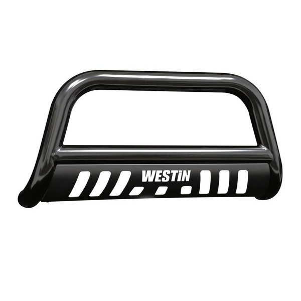 Westins E-Series Bull Bar is a front-end light bar designed for trucks and larger model SUVs. It mounts to the vehicles existing mounting points with no drilling required and comes complete with vehicle specific mount kit. It also features mounting points for 2 auxiliary lights up to 6 inches in diameter. The E-Series Bull Bar features a laser cut Westin block letter logo design on the skid plate. Available in black powder coated e-coated steel with a textured black skid plate backed by a 3 year warranty. Optional license plate bracket is available.